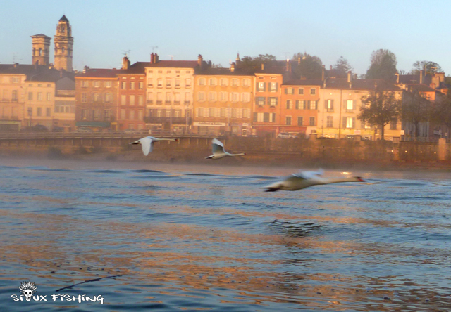 Aux premiers rayons de soleil, alors que notre kayak filait sans un bruit en direction du célèbre pont de Saint Laurent, un joli vol de cygne est venu nous saluer et nous accompagner dans notre effort.