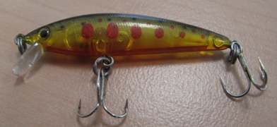 Voilà un leurre assez déconcertant, que j'ai mis du temps à utiliser. Mes premiers essais ont eu lieu en Saône sur les perches et à mon grand étonnement il a été particulièrement efficace. Récemment j'ai pris l'habitude de l'utiliser plus régulièrement lors de mes sorties truite et les résultats ne se sont pas fait attendre.
