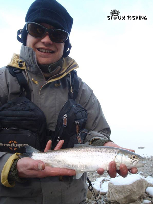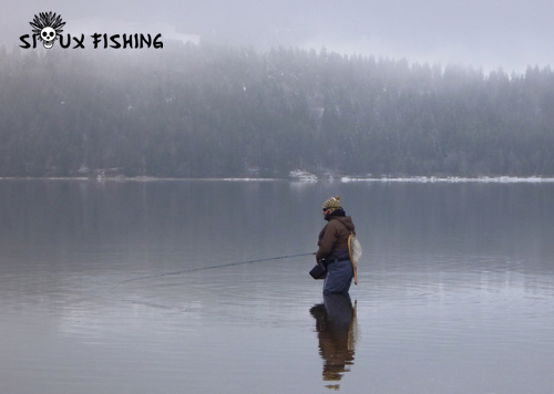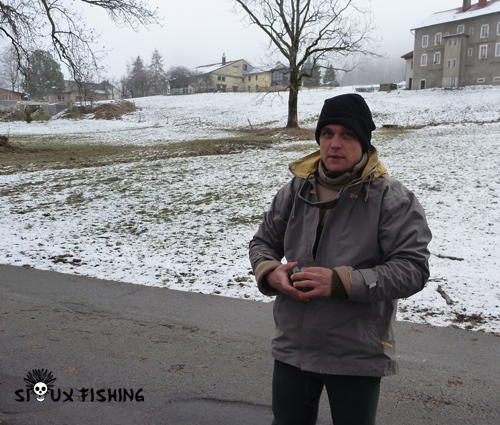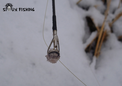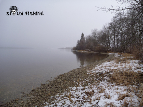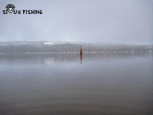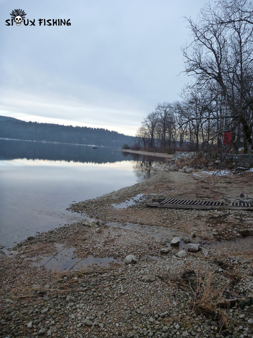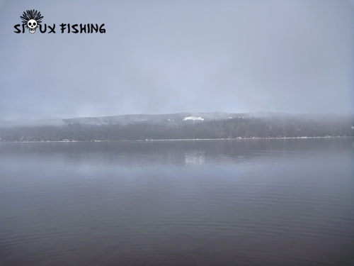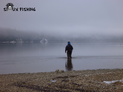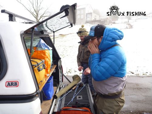 Après avoir récupéré notre carte de pêche journalière, nous nous préparons rapidement et passons à l'action. Comme chaque année, la neige est au rendez vous. Il gèle ce qui complique un peu les choses. Mais le temps est calme, voire même trop calme. Un peu de vent serait certainement plus favorable.