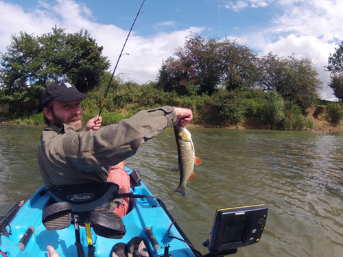 Rem pour sa part utilise un Ecogear SX40F mais sans résultat comparé a moi qui monte 4 petits chevesnes en 1 heure. Ca y est le rem est opérationnel, (en général c’est après mon premier chevesne qu'il démarre et souvent on ne peu plus l’arrêter ) y tape un chevesne et de la ptite perche. Question météo ca s’arrange pas, en plus du vent, des averses. Nous dérivons plusieurs fois en faisant quelques perchettes et nous décidons de faire le voyage de l’autre coté de la Saône pour pêcher la cassure du chenal. En chemin prise de 2 perches sur DD chubby et imatetra mono pour Rem. La cassure ne donne rien et les clapotis, le vent nous empêchent de pêcher correctement, nous décidons de revenir aux ilets. Les chevesnes ont disparu laissant place aux perchettes qui suivent . Rem nous fait suivre un gros morceau, non identifié. Je revois la bête furtive monter sur mon leurre puis disparaitre aussi sec. Il y a quelque chose la dessous nous disons nous. Une manœuvre kayakistique nous positionne 15m en aval du spot. Et la les événements s’ enchainent.