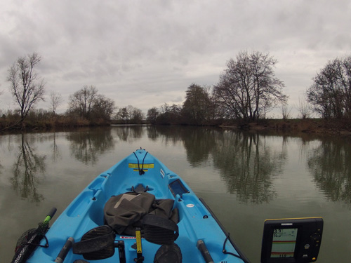 Après cette capture, je n'enregistre plus aucune touche. Sur certains secteurs, la Seille semble vide de poisson alors que sur d'autres les poissons ont commencé à se ressembler. Le sondeur me renvoie de nombreux échos.