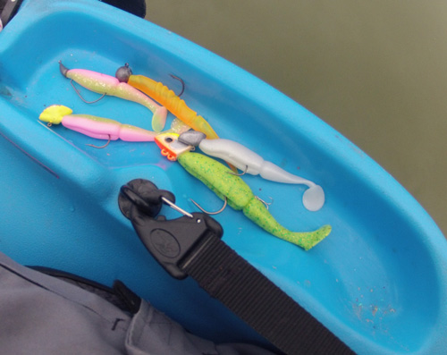 Question leurres, je n'ai sorti qu'un petit lot de one up shad (Sawamura) en 4 et 5 pouces et un Vios Super X layer de Megabass qui présente l'avantage d'être équipé d'un petit rattle (bille bruiteuse). Je monte l'ensemble sur des têtes plombées 21 g, 15 g et 9 g suivant la configuration du poste. J'ai même préparé une petite monture texan légère pour pêcher les arbres noyés (petite exception à mes prospections en verticale).