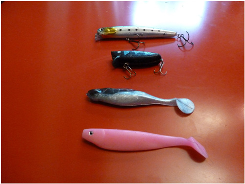 - Leurres : shad gt Delalande custom pour plomb texan, speed gun Gunki, jerkpop, daiwa under surface