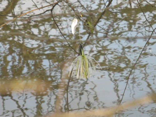 Je pêche les banquettes enherbées noyées sous les eaux au spinnerbait et les zones les plus profondes du chenal. Après une centaine de lancés, un accrochage dans les arbres et la rencontre avec une petite famille de ragondin, le temps commence sérieusement à fraichir.