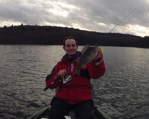Après quelques instants, la belle se montre à nous. C'est une jolie perche de couleur bien sombre.