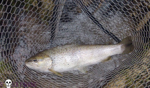 Les poisson n'étant pas très réactifs, je change de taille de leurre et passe au Deep Tail Dancer de 11 cm. Premier lancé et c'est pendu. Le poisson, un peu plus gros (38 cm) lutte bien dans le fort courant avant de se rendre à l'épuisette. Encore un poisson bien gras.
