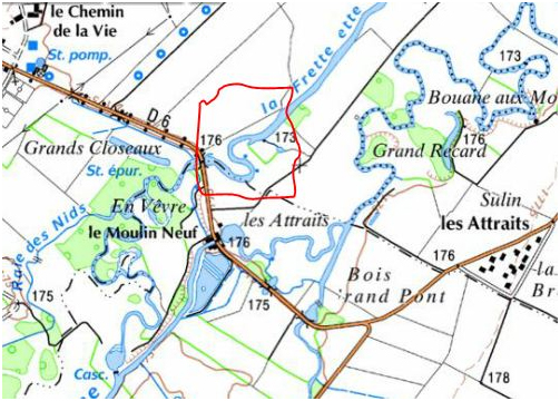 Dans la zone de Marnay, la Grosne se sépare en plusieurs bras, ici c’est le contournement du moulin comme vous pouvez le voir sur la carte( la zone cerclé en rouge).