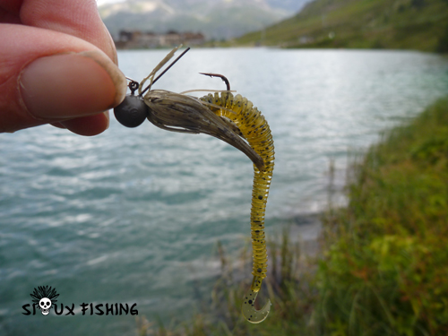 Petit leurre souple Ring Worm 3.7 Illex Gambit monté sur jig. Les truites semblent sensibles à ce montage