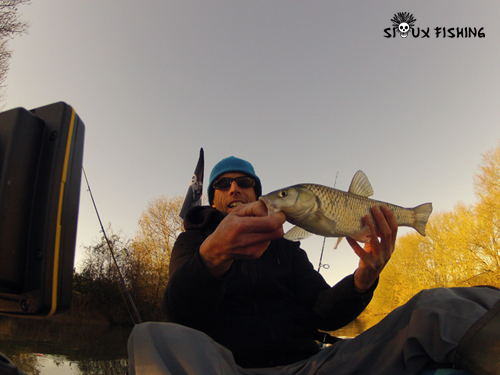 Plus en aval, j'essaie de nouveau une dérive en plein milieu du chenal. L'hiver dernier sur le même secteur, il m'est arrivé de prendre un chevesne sur un one up shad 5''. Après une petite dizaine de mètres de dérive, une touche bien franche vient stopper mon animation. Le poisson est vif et se débat avec vigueur.