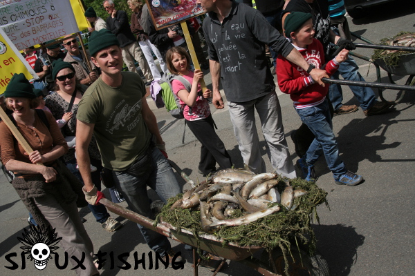 La tête du cortège est menée avec des brouettes remplies de filamenteuses et de poissons en cours de décomposition.