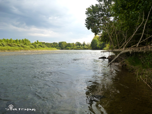 Mais j'arrive tout de même à remonter vers une tête de courant dans laquelle se trouve de grosses pierres. J'aperçois quelques barbeaux et ombres. Après quelques lancés, je touche un poisson. De nouveau c'est lourd. Un, puis deux coups de tête, et le poisson se décroche.