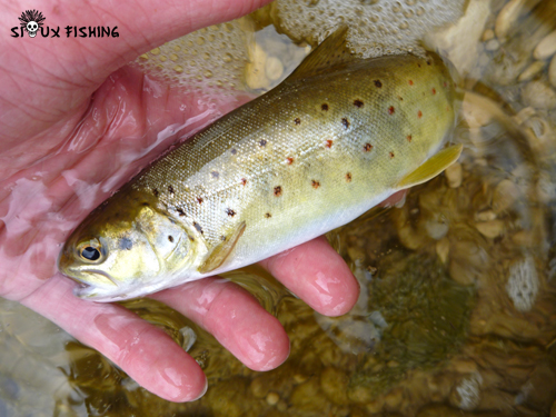 Quelques minutes après avoir débuté ma prospection, je touche dans un fort courant un premier poisson. Au coups de tête, je comprends vite que ce n'est pas bien "épais". Rapidement, une jolie petite truite vient me rejoindre.