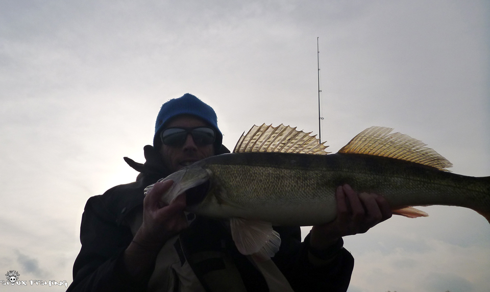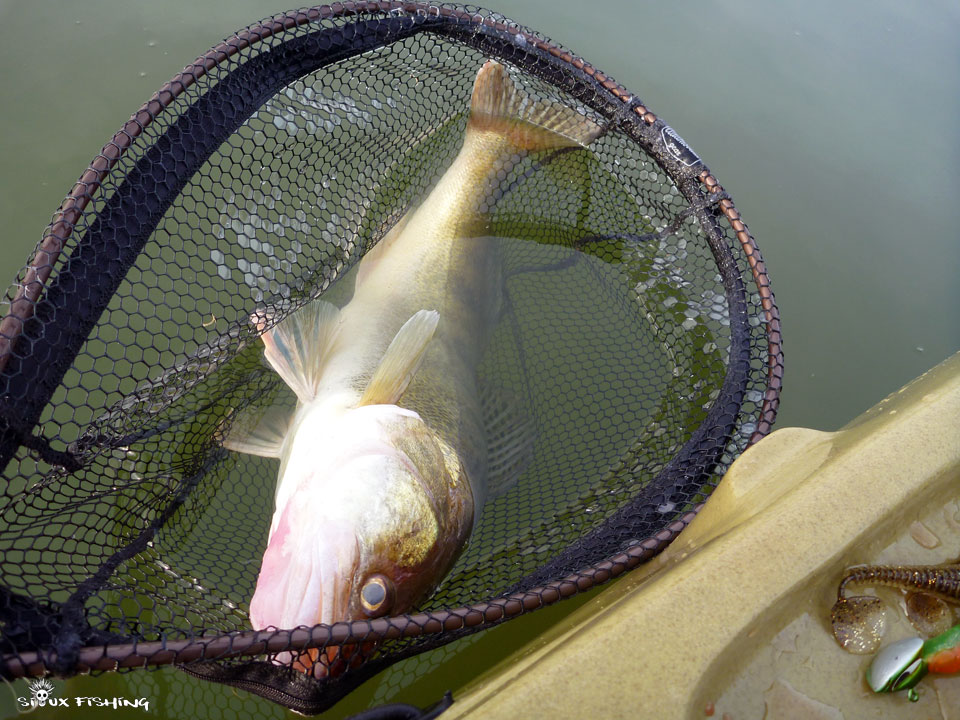 Ce n'est qu' une vingtaine de minutes plus tard, que je réussis à ferrer un poisson. La défense du poisson est lourde, ponctuée de quelques coups de têtes bien caractéristiques. Je tiens un joli sandre, que je réussis à mettre dans l'épuisette. Ce n'est pas un monstre mais l'épuisette est à peine assez grande.