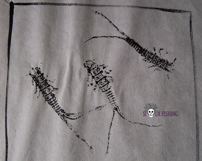 Pour réaliser mes premières empreintes à l'encre de chine (gyotaku), je me suis d'abord essayé sur des leurres souples. A l'origine ces empreintes étaient pratiquées par les pêcheurs japonais pour conserver un souvenir de leur prise ; dans le mot gyotaku, "gyo" signifiant le poisson et "taku" signifiant l'empreinte.