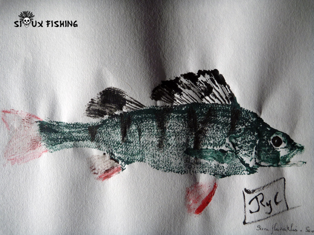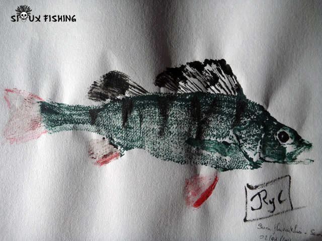 Si jusqu'à présent, je n'avais entrepris de réaliser des gyotaku qu'en noir et blanc. J'ai voulu faire quelques essais en couleurs. Après de nombreux échecs sur des perches soleil, j'ai tenté le coup sur une perche.