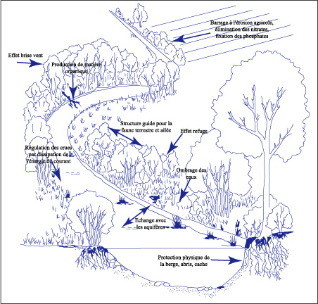 Le petit dessin ci dessous (inspiré des ouvrages de Bernard Lachat - génie écologique) récapitule l'ensemble des fonctionnalités de la ripisylve