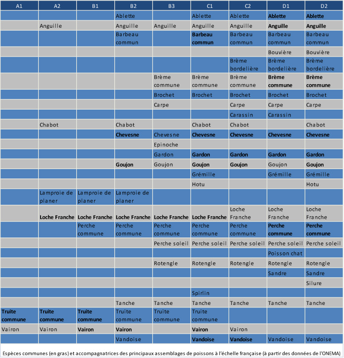 Il a ainsi été proposé à l’échelle française, 9 assemblages de poissons caractéristiques de 9 secteurs particuliers. Ces assemblages se caractérisent par des espèces communes (présentes dans la majorité des sites ou se trouves ces assemblages) et des espèces accompagnatrices.