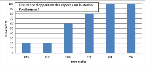 Exemple : Liste des espèces piscicole présente sur la station 1 du Pontbrenon (rivière de 1ère catégorie piscicole) - Bassin Versant du Sornin (dept 71)