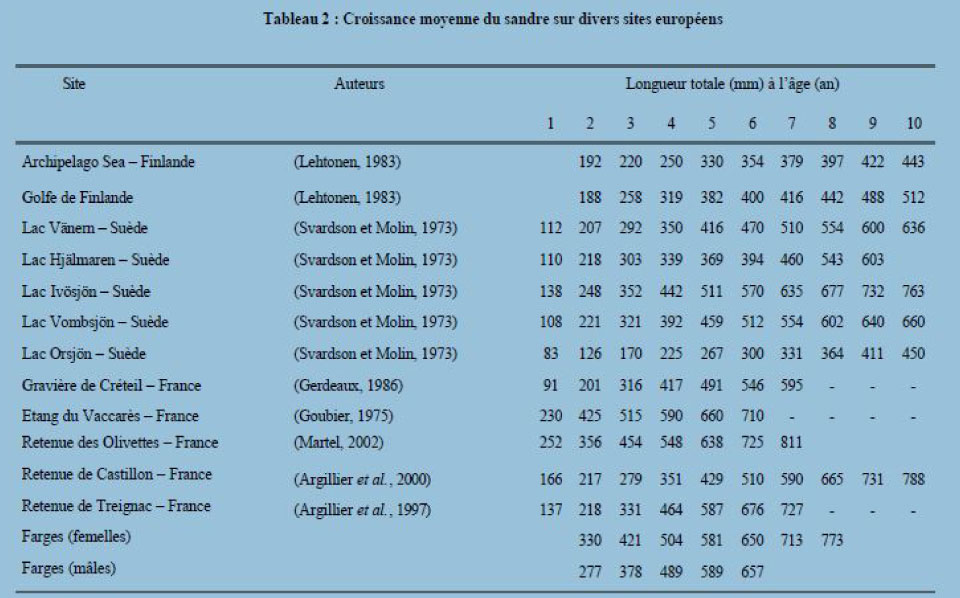 Dans leur étude de détermination de la croissance des sandres de la Saône (commune de Farges, département de Saône-et-Loire) Argillier et Irz ont publié un tableau fort intéressant.