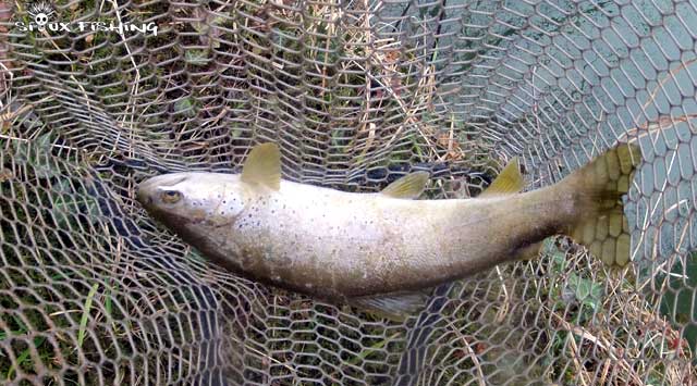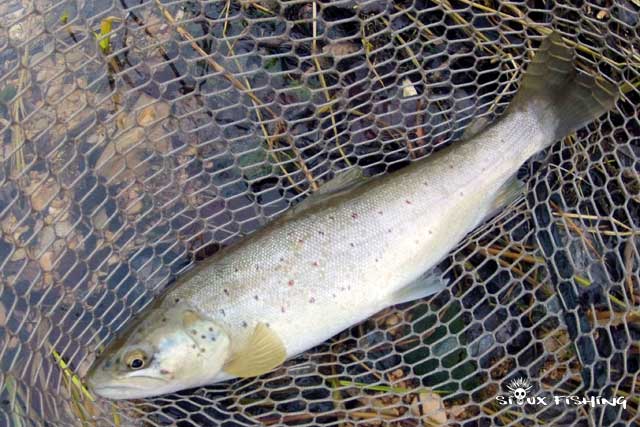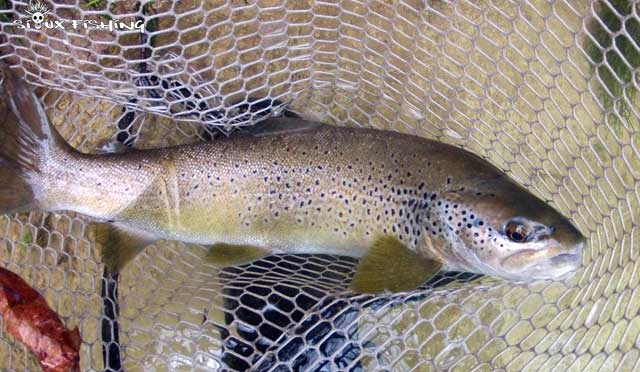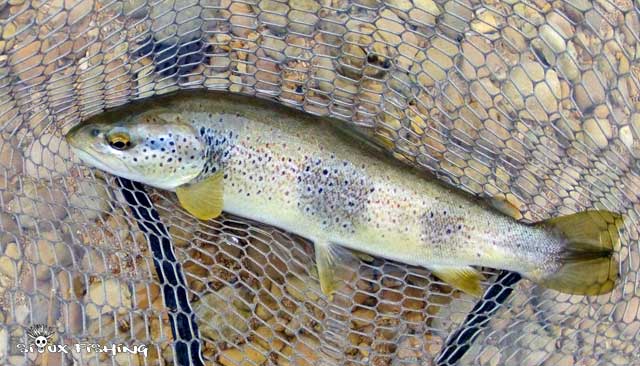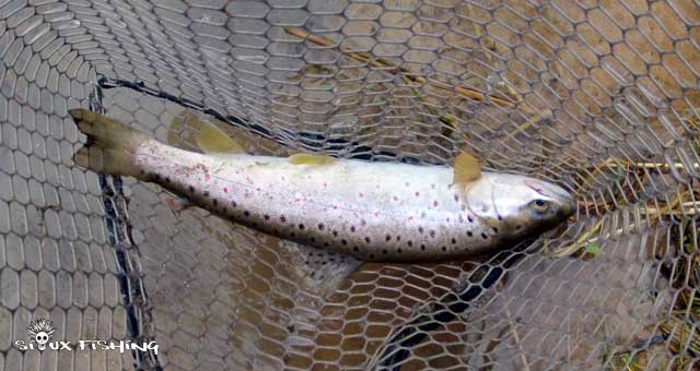 Une vingtaine de mètres plus en amont, la situation se répète. Cette fois, le poisson est plus petit et il finit à l'épuisette. Après une petite photo, il retourne à l'eau.