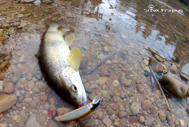 Je doute, dans un premier temps, mais je comprends vite que c'est une première truite qui suit le leurre. Comme je la vois danser derrière le poisson nageur sans s'en saisir, je ralentis les animations et elle finit par se piquer.