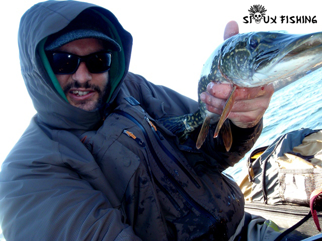 Etant un peu limité par le temps, je décide de pêcher la zone où je me suis mis à l’eau et de remonter vent dans le dos le long de la berge. Je lance, j’attends un peu que ça coule selon la profondeur, puis je ramène tantôt très « sec », tantôt de manière plus douce. Grandes tirées, suivie de « tricotages ». A fond, puis tout doux… La pêche au streamer quoi. De temps en temps, je sens une résistance alors j’attends un peu puis ferre. Herbier ! En fait il n’est pas évident d’être efficace car sur un même lancer, c’est bien souvent qu’il y a une succession de « trou » sans rien (on laisse couler) puis d’herbiers bien dense (faut passer au-dessus) dans lesquels on s’accroche puisqu’on avait laissé couler juste avant. Qu’à cela ne tienne, l’exercice me plaît. Soudain, une touche plus franche, je laisse au poisson le temps de se retourner puis ferre. Pendu. La puissance de la canne me permet de ramener le poisson assez rapidement. Un brochet pas bien gros, mais un brochet quand même !