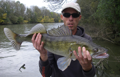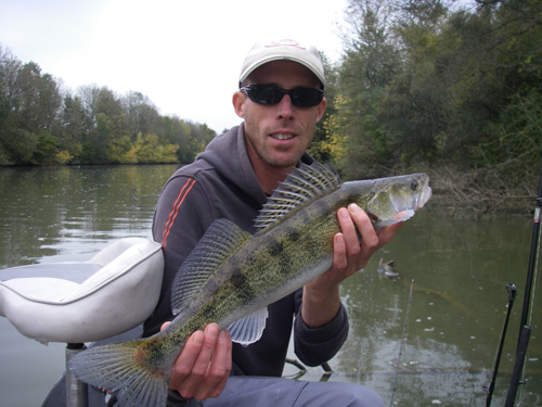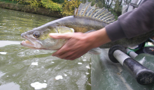 A cet instant, je ressens une sensation bizarre. Pas de toc, mais un poids au bout de la ligne, instinctivement je ferre. Par chance, ce n'est pas une branche, et un joli combat débute. Ce poisson est vraiment combatif, au point qu'on se demande dans un premier temps s'il ne s'agit pas d'un petit silure. Après quelques longues secondes, le poisson monte en surface. C'est un joli sandre de 76 cm. Cool ça démarre bien.