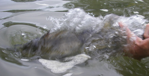 Peu de temps après notre arrivé sur le poste, Olivier ressent une touche. Il me montre son ablette. Effectivement cette dernière est nettement lacérée. Etant à l'aplomb de la zone de touche, je procède en verticale en relevant légèrement mon leurre du fond et en le maintenant sans animation.