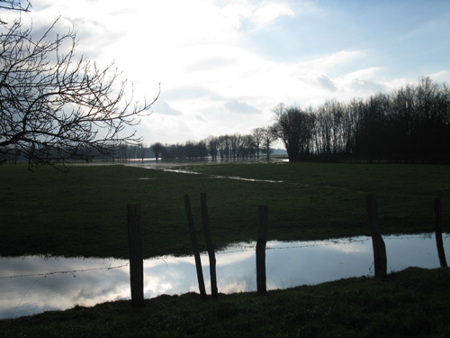 Arrivée sur site, voilà le paysage qui nous accueille. Sous un soleil froid d'hiver, les prairies de la Vieille Seille sont encore inondées. Certaines petites poches d'eau sont encore gelées mais la neige a toute fondue depuis hier.