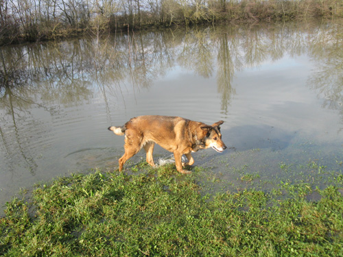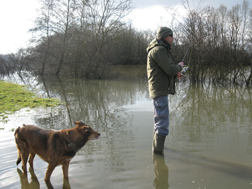 Direction la Vieille Seille ; dans cette retenue d'eau calme, je pense pouvoir pêcher en toute sérénité, même si je sais que les niveaux sont assez hauts et que toutes les berges ne seront pas accessibles. Peu importe, il y aura toujours moyen de se promener, ce pourquoi ma compagne et le chien se joignent à moi pour profiter de l'après midi.
