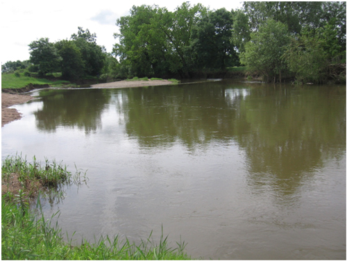 Je chausse les waders et commence à prospecter avec des jerkbait tout fraichement acheté sur ebay. Malheureusement les eaux sont chargées et ça court « un pneu » ce qui pour la découverte est un peu gênant. La rivière n’est accessible que sur une berge (pas moyen de descendre en wadding) mais on peut marcher un moment dans le même pré si on veut prospecter. A mon avis pour se poser en famille c’est bien. Une petite ile par ci, des radiers, quelques arbres dans l’eau, la Grosne dans toute sa splendeur (même si ici nous sommes apparemment sur la Frette).