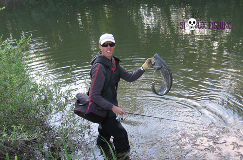 Après de très longues pensées inutiles, je finis par ferrer. C'est nerveux et puissant. Le poisson se prend dans les branches, mais je finis par le hisser sur la berge. C'est un joli petit silure qui effectivement a bien engamé le leurre. Malgré tout et sans trop de difficulté, je décroche mon leurre assez aisément et "le monstre" repart dans son milieu naturel. L'affaire commence plutôt bien.