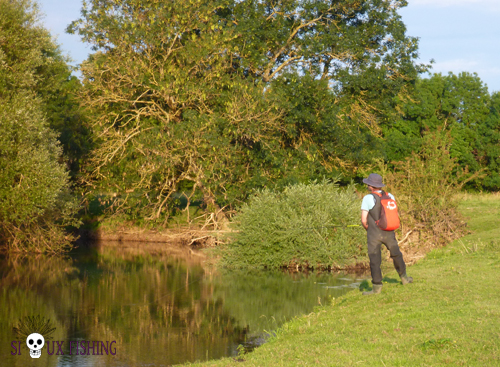 Un peu plus en aval du parcours, c'est un brochet que je vois suivre mon leurre souple. Il vient de la sous berge située à moins d'un mètre de moi. Je réessaie une deuxième fois. Il est encore là mais rate le leurre et repart rapidement dans les fonds de la rivière. Je ne sais pas s'il m'a vu, mais il ne redonne plus signe de vie malgré mon insistance.