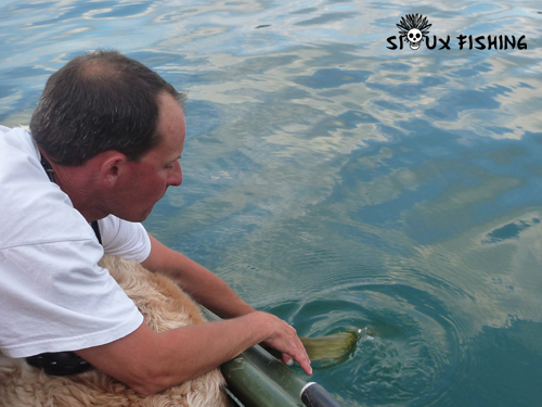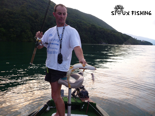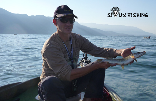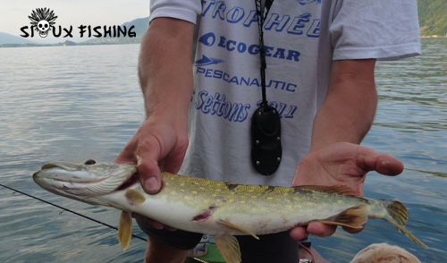 Rapidement Olivier me montre toute sa connaissance du lac et sort les deux premiers petits brochets du jour. Alors que le vent forcit et que la houle s’amplifie encore, j’encaisse un première petite touche sur un énorme shad peu plombé. Instantanément je ferre et c’est raté.