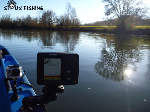 Je continue mes prospection le long d'une bordure que je connais parfaitement pour l'avoir maintes fois pêchée. Je sais l'endroit fréquenté par les sandres et les silures. Rapidement, le sondeur m'annonce la présence de quelques poissons dans 3.5 mètres d'eau. Je suis surpris, je ne m'attendais pas à tant d'activité.