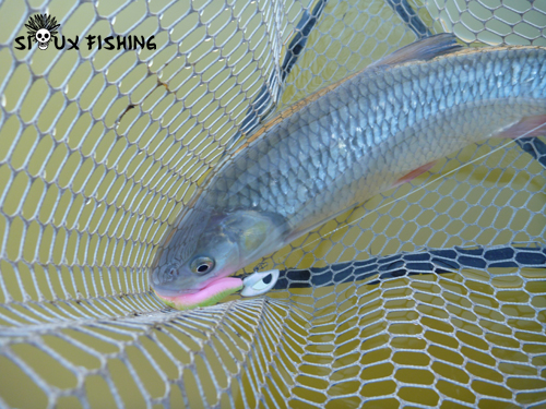 Plus en aval, j'essaie de nouveau une dérive en plein milieu du chenal. L'hiver dernier sur le même secteur, il m'est arrivé de prendre un chevesne sur un one up shad 5''. Après une petite dizaine de mètres de dérive, une touche bien franche vient stopper mon animation. Le poisson est vif et se débat avec vigueur.
