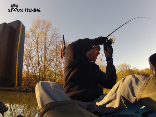 Rapidement en action de pêche, je commence une première dérive en dévalant sur un secteur qui m'est bien connu. Je pêche le centre du chenal. Je laisse le leurre prendre le contact avec le fond et tranquillement je commence à l'animer. Presque immédiatement, je ressens un premier toc bien marqué. Surpris, je pense autant à un accroc qu'à un poisson. Mais après réflexion, je finis par ma dire que c'était surement une touche. Qu'importe, de toute façon, j'avais ferrer.