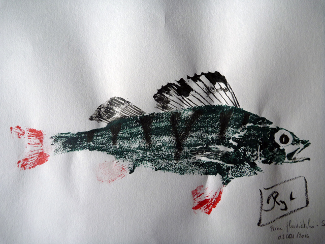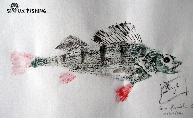 Avec ces écailles rugueuses, la perche est un poisson idéal pour réaliser des gyotaku (empreinte de poisson à l'encre de chine). Sa nageoire dorsale si particulière confère à se poisson une très jolie morphologie. Voici une petite série d'empreintes réalisées à l'automne dernier.