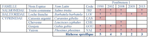 Exemple : Liste des espèces piscicole présente sur la station 1 du Pontbrenon (rivière de 1ère catégorie piscicole) - Bassin Versant du Sornin (dept 71)