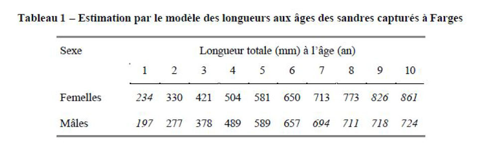 Dans leur étude de détermination de la croissance des sandres de la Saône (commune de Farges, département de Saône-et-Loire) Argillier et Irz ont publié un tableau fort intéressant.